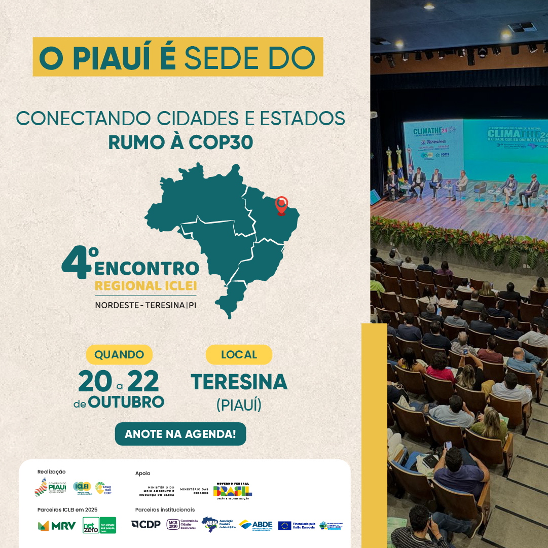 Entre os dias 20 e 22 de outubro de 2025, a cidade de Teresina (PI) sediará o 4º Encontro Nordeste ICLEI Brasil, com o tema “Transição Energética Justa e Resiliência da Caatinga rumo à COP 30”. O evento será realizado pelo ICLEI e pelo Governo do Piauí, ocorrerá no SEBRAE Teresina e reunirá representantes de governos locais, estaduais e federal, além de sociedade civil, academia, setor privado e organismos internacionais, em um espaço de diálogo estratégico para fortalecer a agenda climática do Nordeste no cenário global.